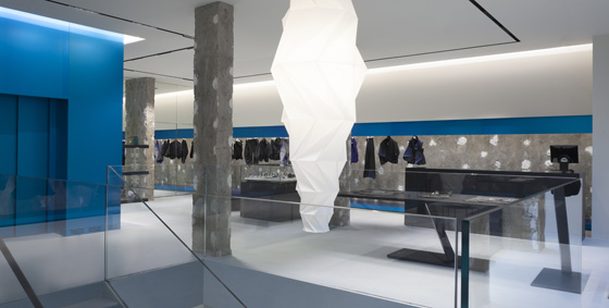 The crisp colours and angular display units and props combine to create a stunning environment. The fully glazed shopfront allows uninterrupted views into this calm yet vibrant store. Shopfittings are kept to a minimum. Even the clothes rails, which follow the store’s perimeter walls, appear to be sunken into the walls – rails, fixtures and hangers are hidden from the eye. This helps instil the effect of a fluid, streamlined store where the clothes are the stars that are allowed to shine brightly. Another surprising delight is the vivid blue highlights. The clothes leap out from the intense backdrop. So often high fashion is understated and muted, but this colour choice is bold and edgy as the creator intended. The vivid blue sets the store alight and sets it apart from its peers, providing a stark contrast to an otherwise monotone interior.