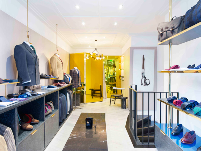 English Cut, London Heading north to an area of London that remains relatively unknown to the hoards of tourists that frequent our cosmopolitan capital lies a British bespoke tailoring brand. Nestling on Chiltern Street, this gentleman’s clothing retailer exudes British spirit, ingenuity and creativity. A wholly British tailor, who only uses British cloth to complete his suits. This little known brand has big aspirations and is the perfect match to our previous luxury footwear retailer, Joseph Cheaney. Campaign Design, together with founder, Saville Row tailor Thomas Mahon, have created a fitting emporium for this exceptional retailer. Although young in business terms – English Cut was launched in 2001 – the brand carries a century’s weight of great British tailoring tradition and prides itself on delivering a bespoke collection. English Cut has chosen to retain its historic shop front and has added a touch of gilt in the details, including the signage, to convey an air of exclusivity. A single bust displays one of the jackets in the window, which is surrounded on all sides by abstract frames - a single item of clothing is suspended within each frame. It forms a nice visual merchandising touch that highlights the brand’s attention to detail. Inside, the serious lack of shop floor dictates the design and it is very simple. On the left perimeter wall jackets and splendid shirts are hung within low, veneer-clad units. Much like a wardrobe, it adds to the personal touch. Accessories such as shirts, ties, shoes and belts are then folded and showcased on the top of these cabinets. Two further busts are hung from the ceiling on gold poles displaying key formal jackets with additional minimalist style shelving in-between, drawing your attention to co-ordinating attire. On the opposite side of the store a range of footwear is displayed on low level cabinets. The unit reaches to the ceiling with two gold poles and just has three equally spaced shelves above it; one to display an array of colourful ties, one to display a selection of shirts and the last to showcase leather holdalls and bags. A very narrow, freestanding display table is positioned in the centre leaving just enough room to shop the store. At the rear a sunshine yellow, mirrored, acrylic screen grabs your attention and separates the cosy changing area. It creates a bold modern statement in this subdued, classy interior. The ceiling is white and retains the elaborate turn of the century cornicing and panelling. A very distinctive pendant light feature brings another contemporary twist to this traditional ensemble. The walls, which are clad with textured panelling, bring a subtle reference to the materials used in tailoring. The chevron flooring, whilst neutral in tone, also adds further layers of mercantile context. Downstairs has an even more intimate feel; a blue, velvet curtain is used to mask off the changing area at the back of the store and a large cutting table showcases the various fabrics that are available. A tape measure is casually slung over a wall mounted garment rail that is also used to display sample jackets. Everything in this retail outlet is measured and refined, balanced and co-ordinated. It is a perfect mix of modernity and tradition, which precisely mirrors the brand’s ethos. It is a very fine example of the power of the quality independent. |