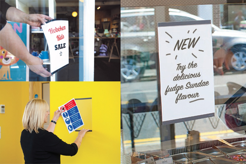 Simply remove the protective layer from one side, insert the sign and then apply to the surface. Remove and re-apply as required. It is suitable to be used on a wide variety of surfaces: for example on glass, doors, windows, exhibit cases, painted walls, metal, wood or surfaces.