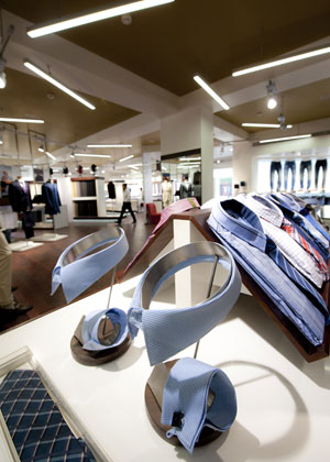 Within the apparel section mannequins are displayed sparingly sited in pairs against grey panels. Busts are individually mounted on white plinths in front of angular frameworks that are suspended from the ceiling. Material samples are displayed on the reverse. Clothing is hung on angular metal rails within wardrobe style, white box units. Folded items are merchandised on large white display tables with dark wood tops. Further garments are displayed on the ultimate hanging rail; concealed beneath a thick glass top – ingenious.