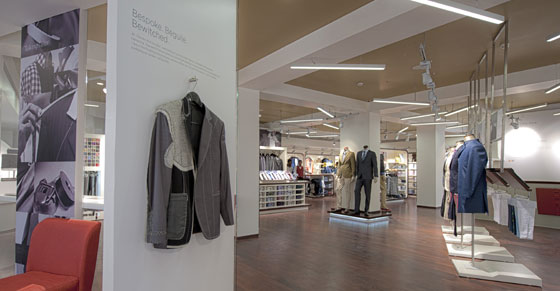 At the entrance to Studio Arvind, a single jacket is artfully displayed against a large grey panel with inspirational words printed above in a light, modern font. Beyond, rows of fabrics can be seen merchandised on sturdy, white wood perimeter units edged with dark wood trim. Similarly designed display tables showcase a selection of collars, cuffs and buttons. These are sited below a row of feature spots each individually housed within dark wooden casing. Further panels feature throughout the store and convey short quotes, tasters to help guide you towards your final item.