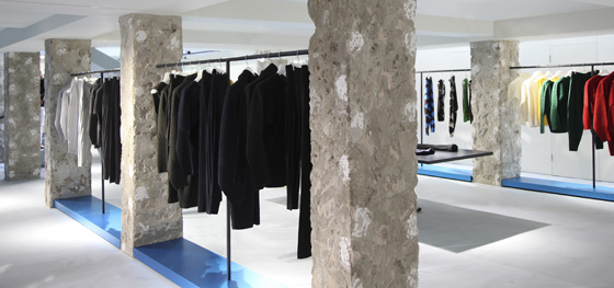 The crisp colours and angular display units and props combine to create a stunning environment. The fully glazed shopfront allows uninterrupted views into this calm yet vibrant store. Shopfittings are kept to a minimum. Even the clothes rails, which follow the store’s perimeter walls, appear to be sunken into the walls – rails, fixtures and hangers are hidden from the eye. This helps instil the effect of a fluid, streamlined store where the clothes are the stars that are allowed to shine brightly. Another surprising delight is the vivid blue highlights. The clothes leap out from the intense backdrop. So often high fashion is understated and muted, but this colour choice is bold and edgy as the creator intended. The vivid blue sets the store alight and sets it apart from its peers, providing a stark contrast to an otherwise monotone interior.