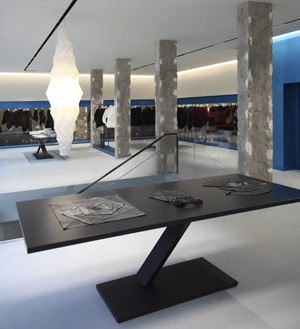 On the lower ground floor, in addition to the discreet, perimeter clothes rails, further hanging rails have been fashioned between the statement pillars. Very basic, black anodised rods have been secured between pillars with a vivid blue base. There is a large blue pouffe which complements the items on display in its irregular design and finally a few simple anodised black display units showcase some very exclusive product. This is a store for the discerning customer but one which SDEA thoroughly recommends – it is a great store.