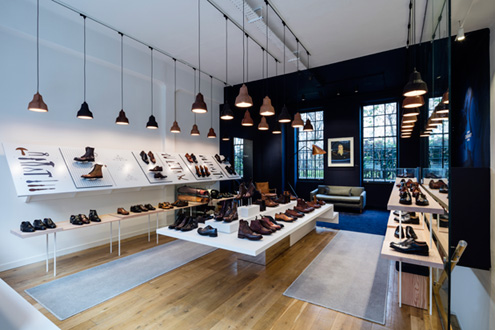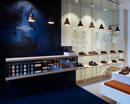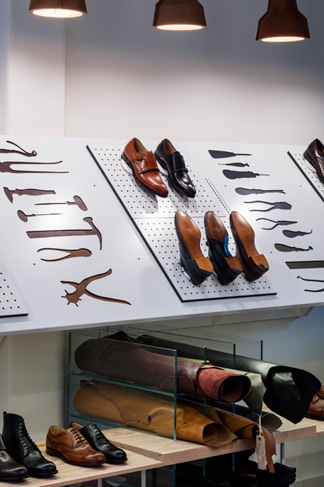 Here is a store that exudes brand heritage in an entirely contemporary fashion. Joseph Cheaney & Sons has an inherent quality and craftsmanship that spans more than a century and is often lacking in much of our modern culture. This high end retailer has been designing and manufacturing every element of its shoes and boots from its factory in Northamptonshire since 1886. Whilst it has undergone numerous changes to stay afloat during a difficult history encompassing two world wars, it has remained true to its business ethos. The new store might be small but it is a perfect example of a great retail interior. The striking black exterior aptly frames the stylish interior, which can be glimpsed through the windows of the beautifully restored, historic facade. Relatively little product lies between you and the inside; a sloping board displays two pairs of shoes alongside detailed drawings of the shoemakers tools to hint at the handmade product. If you’re lucky you’ll see the staff polishing and shining the footwear on the polishing station in the window that doubles as a display counter and adds an element of retail theatre. You are immediately drawn into the well designed and beautifully presented high end establishment.