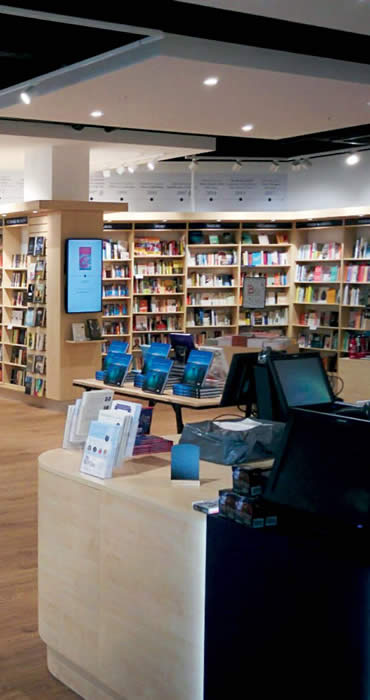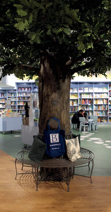 Windows are also of great significance and their displays form an integral part of this immaculately presented concept. A giant wheel attached to a model of the Eifel Tower fills one of the left hand windows and provides a formidable marketing opportunity for authors, whose books can be positioned on and around the Ferris wheel. From outside the store the word ‘books’ is spelt out across the entire shopfront in large, three dimensional graphics. The B however doubles as the Blackwell’s logo, the detailed design being displayed here in extremely large format with the wheel serving as an ‘O’. It captures the imagination before even entering and emphasizes what’s inside. The store is well lit, the ceiling left open with numerous, giant size, suspended white panels having sunken spots and additional track lighting to wash light through the space. The freestanding, neat, light oak shelving units are positioned at angles to assist your passage and are interspersed with low level display tables for showcasing various book related gifts and accessories.