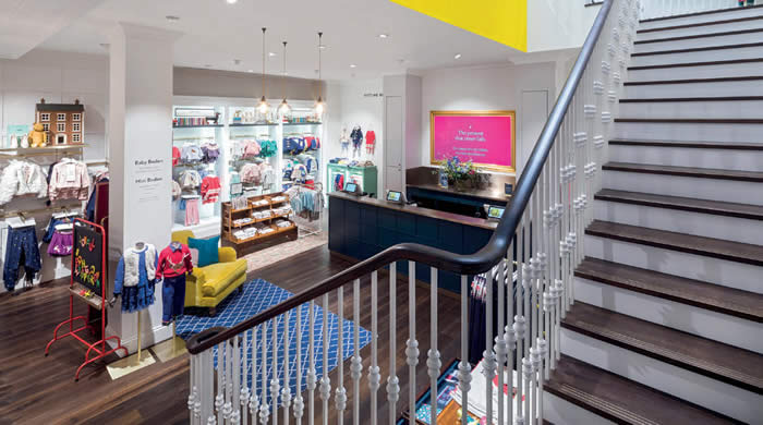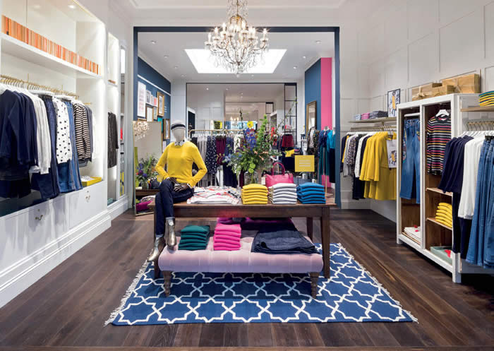 Although set within a thoroughly modern building, the shop assumes the appearance of a grand Georgian house complete with individual rooms, fireplace and grand staircase all with what appear to be original features (although in reality, replicas). Enter through the contemporary glass frontage at either end of the store and you are immediately immersed in a remarkably light and airy interior that appears far greater than its actual size. This feeling is enhanced by the surprisingly high ceiling that is fitted with recessed spotlights, as well as the roof light cut into its centre that casts light onto the space below. The crisp white walls and ceiling provide the clothes with a blank canvas on which to shine, for Boden is blessed with colour as well as style. The dark wood floor then provides a stark contrast to the minimal interior and further highlights the product range with great effect. Fixtures and fittings also follow the Georgian theme. At either end, panelled walls feature large, recessed wardrobes on either side of the perimeter walls, which showcase clothing hung on rails and folded on shelves. Exquisite glass chandeliers hang from the ceiling creating show stopping centre pieces suspended above antique tables. These display clothing and accessories, alongside vases of flowers and framed pictures, as if in a home. A rug is placed beneath the table to complete the look.