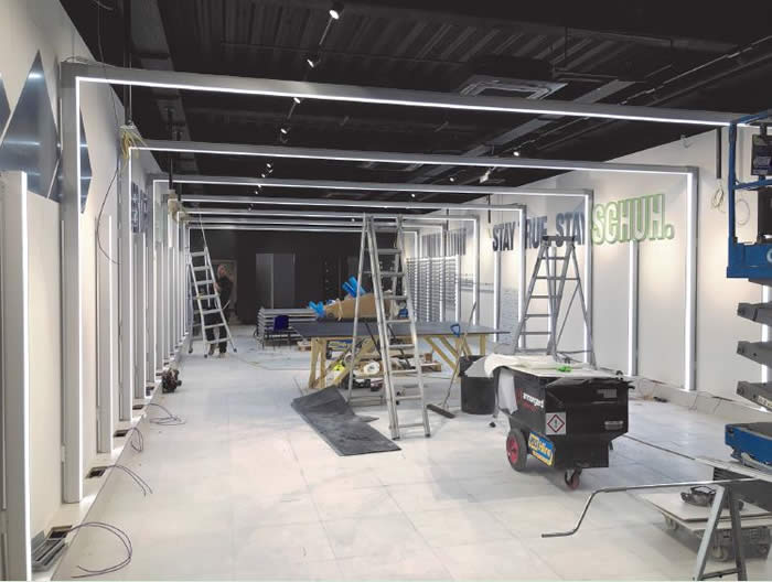profile fabrication, luminaire assembly and electrical testing to flow smoothly and effectively through their recently extended Manchester production facility. For just 1 of schuh's 132 stores, Unibox supplied over 120m of illuminated profile for the archways, along with nearly 1000m of RSB extrusion with bespoke brackets, all delivered on time and to budget.